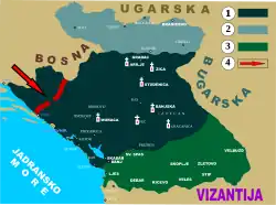 Территориальные приобретения Милутина. 1 — территория Сербии в начале его правления, 2 — земли Стефана Драгутина, 3 — завоевания к 1299 году, 4 — временная потеря части Хума