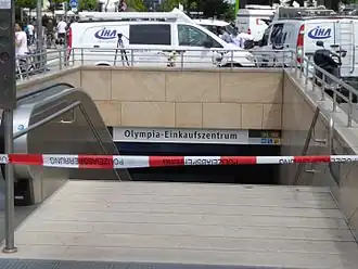 Затем убийца перешёл на другую сторону Ханауэр-штрассе и направился через центральный вход в здание торгового центра «Олимпия», где настиг свою последнюю жертву возле эскалатора смертельным выстрелом, после чего через крытый мост отправился на крышу расположенного по соседству здания крытой парковки, по пути выполнив несколько выстрелов в сторону прохожих на парковке, однако не поранив никого при этом. После того, как он расстрелял два пустых припаркованных автомобиля в 17:59 он направился на крышу, где вступил в словесную перепалку с находящимся на балконе жителем расположенного по соседству на Рисштрассе (нем. Riesstraße) жилого дома[3]. Мужчина, услышав выстрелы, принял их за петарды и даже бросил с балкона в сторону преступника пивную бутылку, сопровождая оскорбительными и расистскими оскорблениями[4]. Во время этой ссоры преступник несколько раз выстрелил в сторону находящегося на балконе мужчины. При этом ранения получил другой 47-летний житель, находившийся на другом балконе и получивший ранения от осколков пули. В конце концов, преступник сделал ещё несколько выстрелов в сторону торгового центра, однако при этом никто не пострадал[3][4].