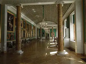 Основная часть коллекции живописи принадлежала графу А. С. Строганову[18]. На втором этаже здания в анфиладе комнат вдоль фасада по набережной р. Мойки архитектор Демерцов устроил картинную галерею. Завершал постройку Воронихин. Галерея с кессонированными сводами и колоннами в начале и в конце изображена на акварели «Вид картинной галереи графа А. С. Строганова», написанной самим Воронихиным в 1793 году (Эрмитаж). В Картинной галерее проходили занятия воспитанников Академии художеств. Накануне кончины граф А. С. Строганов попросил перенести его в галерею, чтобы умереть среди собранных им произведений искусства[19].
