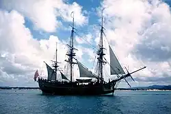 Судно было построено для фильма «Мятеж на „Баунти“». Судно затонуло у побережья Северной Каролины во время урагана «Сэнди» 29 октября 2012 года, 14 из 16 членов экипажа удалось спастись, при этом погибла Клавдия Кристиан, которая являлась прапрапрапраправнучкой Флетчера Кристиана — помощника капитана корабля-оригинала HMS Bounty. | HMS Bounty | Корабль, на котором во время экспедиции за хлебными деревьями в Тихом океане 28 апреля 1789 года произошёл мятеж, ставший основной темой нескольких пьес, книг и стихотворений. | |
