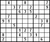 Середина верхнего ряда блоков 3×3 и середина нижнего ряда блоков 3×3 почти полностью заполнены. В середине верхнего блока три нерешённых числа — 1, 4, и 9. Анализируя такую ситуацию, можно вписать число 4 в центр блока, число 1 в правый верхний угол, а число 9 — в левый верхний угол. Аналогично можно поступить с нижним центральным блоком 3×3: в нём отсутствуют числа 6, 8 и 9. Ячейки заполняются последовательно: число 6 ставим в центр, число 9 в нижний правый угол, а число 8 в нижний левый угол.
