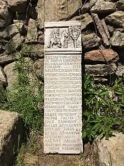 Во времена царя Реметалка II — сына великого царя Савромата II, и Зенона — сына Фаннеса, эмиссара царя Рискупориса, а также [во времена] Хофарнаса — сына Сандарциоса, Бабоса — сына Баиораспеса, Ниблобороса — сына Досимахартоса, Хороатоса — сына Сандарца, архонта танаисцев Хофразмоса — сына Форгабакоса, Басиледеса — сына Теонеикуса, элленарха. Изготовлено за свой счёт консулом, чтобы вновь отремонтировать [площадь] для города и для торговцев, под надзором Зенона — сына Фаннеса, Фарнохартоса — сына Тауреуса, Фальдараноса — сына Аполлониуса, а также архитектора Диофантуса — сына Неополуса и Аурелиуса — сына Антониуса, Науакоса — сына Меуакоса.