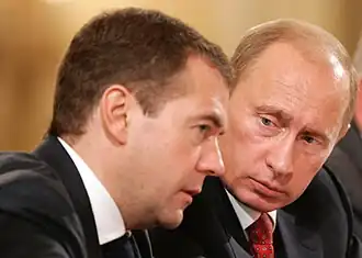 На президентских выборах 2008 года Дмитрий Медведев был избран президентом, набрав 70,28 % голосов. Он был выдвинут кандидатом от четырёх российских политических партий и во время предвыборной кампании пообещал назначить Путина на пост Председателя Правительства РФ[5].
