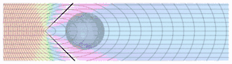 Поскольку тахион движется быстрее света — увидеть его приближение невозможно. Но когда он пройдёт точку, ближайшую к наблюдателю, тот увидит появляющийся объект, разделяющийся на две части, которые движутся в противоположных направлениях. На рисунке тахион движется справа налево. Чёрная линия — это ударная волна черенковского излучения, показанная в момент времени, где тахион находится ближе всего к наблюдателю. Этот эффект двойного изображения наиболее заметен для наблюдателя, расположенного как можно ближе к траектории сверхсветового объекта. Правая синеватая форма — это иллюзия, образованная синим доплеровским сдвинутым светом, идущим на наблюдателя, который расположен на вершине угла чёрных черенковских линий от тахиона по мере его приближения. Левая красноватая иллюзия формируется из красного смещённого света, который остаётся от тахиона уже после прохождения наблюдателя.