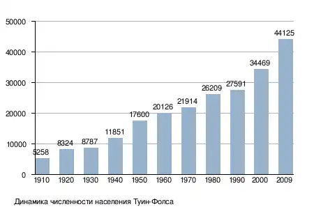 На 2010 год население Туин-Фолса составляло 44 125 человек[9]. С 2000 года рост населения составил 28,0 %[9]. Плотность населения составляет 1027 чел./км². Средний возраст жителей — 39 лет и 11 месяцев[10]. Половой состав населения: 48,7 % — мужчины, 51,3 % — женщины. Расовый состав населения по данным на 2010 год[9]: