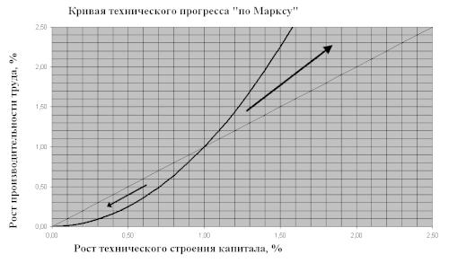 Этот сценарий можно представить, как «кривую технического прогресса». Увеличение ТСК приводит к непропорциональному увеличению производительности труда, как это показано на рисунке, который исходит из предположения, что эта закономерность начинает проявляться при росте ТСК более 1 %. Если же это выгодно для капиталиста, то он будет всю свою прибыль инвестировать в повышение ТСК, а не в создание дополнительных рабочих мест.