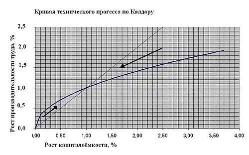 Последнее, правда можно было бы рассматривать как некое произвольное допущение. Но если верно то, что возрастание ТСК приводит к ещё большему увеличению производительности труда, то для предприятий не существует никаких границ. Можно ставить вопрос только о внешних ограничителях, например то, что в соответствии с какими-то техническими причинами ТСК не может произвольно быстро расти. Когда Николас Калдор (см. выше кривую технического прогресса по Калдору) постулирует постепенно ослабевающее действие высокого прироста ТСК, то это действительно можно рассматривать как произвольное допущение, необходимое для того, чтобы представить стабильный экономический рост. Поэтому буржуазные экономисты и исходят из допущения «хорошего поведения» кривой технического прогресса ввиду желательности соответствия их теорий устойчивому равновесному развитию.