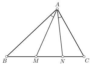 Пусть через вершину треугольника внутри него проведены две прямые, образующие равные углы со сторонами и и пересекающие сторону в точках и . Тогда