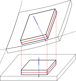 Это смещение можно разложить на векторную сумму смещения срединной поверхности и смещение вне плоскости в направлении . Мы можем записать смещение срединной поверхности в плоскости как