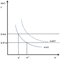 Максимизация в зависимости от размера резервной заработной платы также представлена на рисунке Модель поиска работы с резервной заработной платой[9][11].