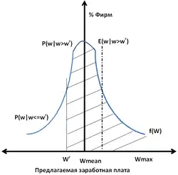 На рисунке Распределение предлагаемой зарплаты указана кривая вероятного распределения предлагаемой заработной платы . Зная, какая фирма предложит максимальную заработную плату , работник мгновенно бы устроился на работу именно в эту компанию. Но при отсутствии такой информации работник будет искать работу, предлагая свой труд компаниям с вакансиями, по принципу случайной выборки, сравнивая предлагаемые уровни заработной платы и выбирая допустимую для него. Имеется два варианта[9]: