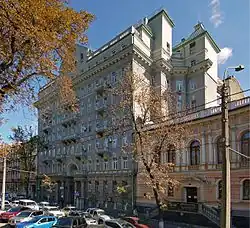 В 1917—1918 годах в квартире № 27 на четвёртом этаже находилось Украинское научно-техническое общество «Праця» («Труд»), там же была канцелярия созданного «Працей» и киевским обществом «Просвещение» Украинского народного университета. С обществом «Праця» и университетом связана деятельность учёных и общественно-политических деятелей — В. А. Вилинского, И. И. Левинского, И. И. Огиенко, М. И. Туган-Барановского, К. В. Широцкого.