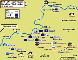 Рано утром 10 апреля 1809 года эрцгерцог Карл пересек Инн и вторгся в Баварию, в то время как в то же время эрцгерцог Иоганн пересек итальянскую границу со своей австрийско-итальянской армией. Это одновременное наступление положило начало войне Пятой коалиции. Целью австрийцев было прежде всего вернуть территории, утраченные после войны 1805 года, и вытеснить французов из Центральной Европы, в то время как большая часть французской армии была скована войной в Испании за Пиренеями. Австрийцы оттеснили баварскую армию через Изар к Абенсу. 3-й армейский корпус маршала Даву численностью более 60 000 человек, который располагался лагерем в Верхнем Пфальце близ Регенсбурга, был застигнут врасплох австрийским наступлением и последующим продвижением почти к Дунаю и почти изолирован от основных французских армий на Лехе. Даву двинул свой корпус на юго-восток в попытке соединиться с баварцами маршала Лефевра и другими французскими частями.