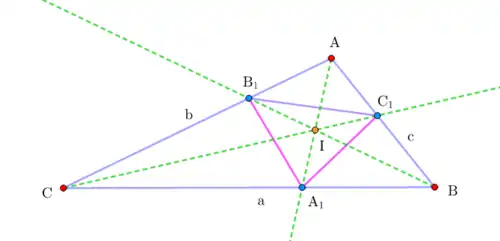 - Рассматриваются также аналогичные треугольники, в которых равнобедренным является не треугольник, образованный основаниями биссектрис внутренних углов, а треугольник, образованный одним основанием биссектрисы внутреннего угла и двумя основаниями внешних биссектрис к двум другим углам.[5]