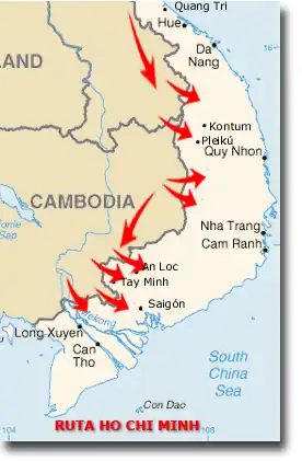 - ↑ На территории Камбоджи «тропа Хо Ши Мина» встречалась с менее известной «тропой Сианука», по которой в Южный Вьетнам направлялись военные материалы, поступавшие через порт Сиануквиль. Следует заметить, что это было нарушением нейтрального статуса Камбоджи, установленного Женевскими соглашениями 1954 года.