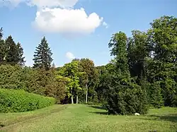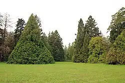 Особое место занимают хвойные растения, которыми засажены наиболее рельефные места парка, они удачно использованы при оформлении полян, прудов, отдельных парковых массивов. Благодаря хвойным видам необычный художественный колорит создаётся в парке в течение летнего периода и зимой. Низкорослый можжевельник казацкий, которым покрыты крутые склоны, горки и их подножия и берега прудов, эффективно выполняет почвозащитную функцию, не допуская смывов и эрозии почвенной поверхности. Высокорослые виды рода туя, пихта, ель, сосна и другие с их чрезвычайно декоративными голубыми, серебристыми, золотистыми, плакучими, пирамидальными и пологими формами использованы для создания живописных пейзажей в виде отдельных групп или одиночных экземпляров на открытых местах. Здороваясь с парком, посетитель встречается с Вестибюльной поляной, шагая вдоль берега Большого пруда — с поляной Шевченко, потом открываются Тисовые, Кедровая, Берёзовая лужайки и поляны огромных туй, такие как «Три сестры» и «Восемь братьев». Центральный мост через Большой пруд ведёт к «Швейцарскому» ущелью и вершинам рукотворных гор: Косматый, Сторожевой, Дедова, Ротонда, где встречаются скифские каменные бабы. Возле мраморного памятника, который заказал хозяин парка И. М. Скоропадский незадолго до смерти, начертаны обращённые к посетителям слова: «Любезный прохожий! Сад, в котором ты гуляешь, посажен мной; он служил мне утешением в моей жизни. Если ты заметишь беспорядок, ведущий к уничтожению его, то скажи об этом хозяину сада: ты сделаешь доброе дело».