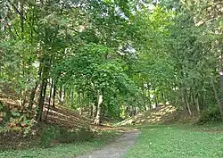 Таким образом, площадь защитных насаждений была доведена до 155 га, из которых 100 га занимали хвойные виды. С 1858 г. начался новый этап в строительстве Тростянецкого парка — преобразование равнинной местности в рельефный ландшафт. Сначала работы осуществляли на 5 га, со временем площадь была расширена до 30 га по обе стороны от Большого пруда. Руководил работами главный садовник К. Д. Шлинглоф. С целью создания горного рельефа на отведенных участках частично вырубали существующие насаждения, а в местах, где создавались высокие горки, они становились каркасом и полностью засыпались землёй. В результате работ, которые проводили около 30 лет, был создан гористый рельеф, где высота отдельных горок достигала 35 м. Горки обсаживали деревьями, главным образом, соснами и различными видами кустов.