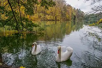 Усадьба, которая включала большой деревянный дом с башнями и четыре флигеля, была сооружена в 1833 году вблизи ручья Тростянец, который был использован для создания системы прудов. Путём углубления балок и отсыпки дамб был создан Великий став, длиной 1,3 км и шириной около дамбы почти 100 м. Он разделяет парк посередине с севера на юг и является его композиционной осью. С разных сторон вокруг этого озера созданы два меньших по размерам — Лебединый и Короткий. В целом водная поверхность составляет более 10 га и является одним из важных элементов паркового ландшафта. Уровень грунтовых вод находится в пределах 5-10 м, однако в низинных местах они часто выходят на поверхность в виде открытых источников, благодаря которым в парковых прудах поддерживается стабильный уровень воды.