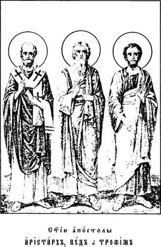Трофим святый, его же апостольские Деяния воспоминают, и Павел святый в Послании втором к Тимофею: «Трофима же (рече) оставих в Милете боляща». Сей с Пудом и Аристархом во всех гонениях Павлу святому последова и наконец при усечении его в Риме от Нерона вси триe усекновени суть.