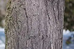 У молодых деревьев кора красноватая или тёмно-коричневая, чешуйчатая. С возрастом она становится толстой и глубоко бороздчатой с плоской вершиной, приобретая тёмный седовато-коричневый оттенок. Чешуйки коры отслаиваются. Если кору сломать, части разлома покрываются фиолетовыми крапинками[8]. Толщина коры взрослых деревьев составляет 1,3—2 см[6].