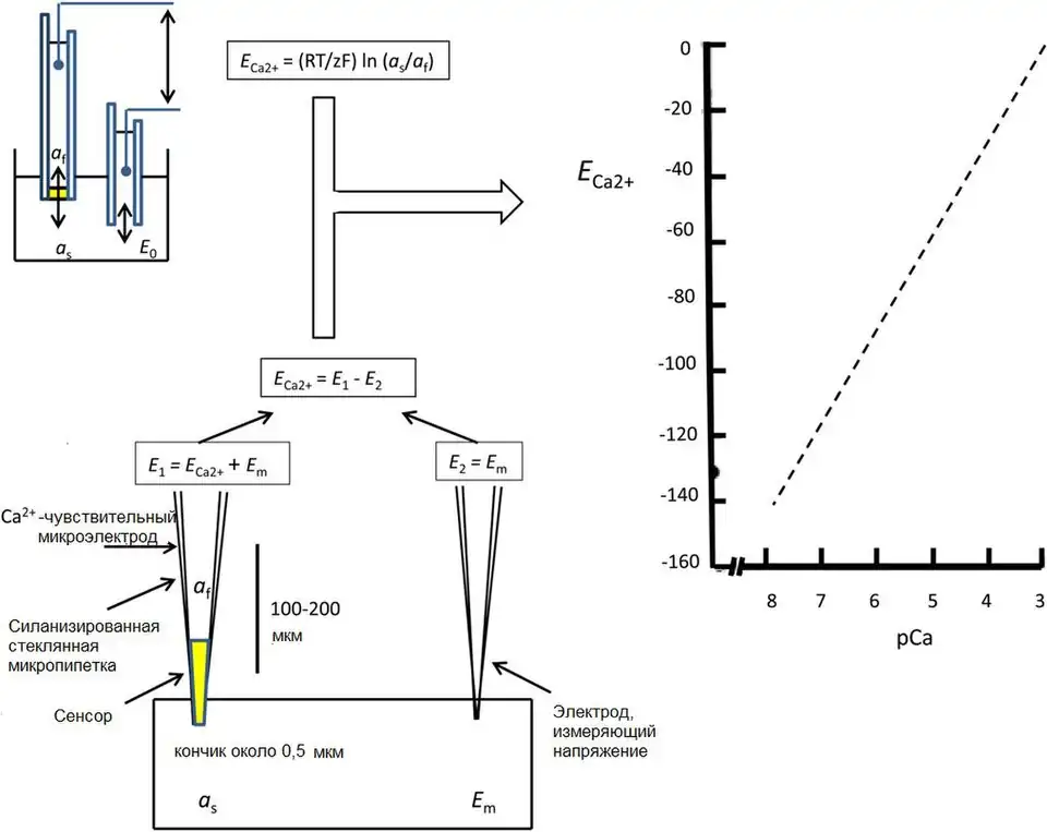Рис. 1. Разработка и использование кальций-чувствительных электродов. (а) Разность потенциалов ECa2+, имеющаяся на границе кальций-селективной мембраны, по отношению к потенциалу сравнения E0 как результат различной активности кальция в изучаемой жидкости, as, и в пространстве электрода, af. (б) Схема микроэлектродного анализа для измерения активности кальция в способной к возбуждению клетке с мембранным потенциалом Em. Активность измеряется путем сравнения потенциалов, находящихся на двух электродах: тетрафенилфосфоний-оксонольном кальциевом сенсоре (E1) и измеряющим обычное напряжение (E2). (в) Теоретически ожидаемая калибровочная зависимость по уравнению Нернста, в которой при pCa = 3 наблюдается отсутствие потенциала