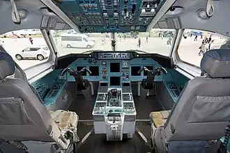 Кабина экипажа максимально унифицирована с кабинами самолётов Ту-204/214, она спроектирована по принципу «тёмной кабины» на основе современных эргономических норм.