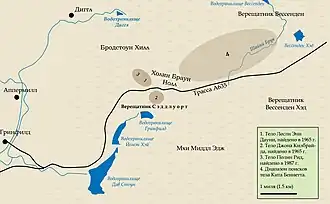 Карта Сэддлуорта, показывающая места, где были найдены тела трёх детей, и область поисков тела Кита Беннетта