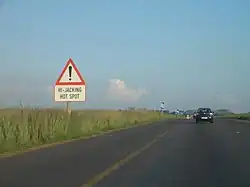 Разбойные нападения на водителей являются серьёзной проблемой в ЮАР. Ряд дорожных знаков предупреждают водителей о том, что некоторые районы для них опасны. В стране было совершено 16 тыс. угонов автомобилей в 1998 году.[5]