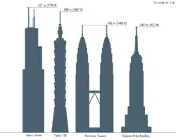 Башни-близнецы «Петронас» в Куала-Лумпуре высотой 452 м, включая декоративные шпили, после завершения своего строительства в 1998 году были объявлены самыми высокими зданиями в мире. С этим согласились не все: появились две категории определения самых высоких зданий. Башни-близнецы «Петронас» считались самыми высокими в одной из категорий. После окончания строительства здания Тайбэй 101 здания «Петронас» уступили первенство в высоте вместе со шпилем, а Уиллис-тауэр потерял первенство в высоте крыши. Тем не менее высота антенны Уиллис-тауэр в настоящий момент превосходит высоту шпиля Тайбэй 101 на 22 метра.