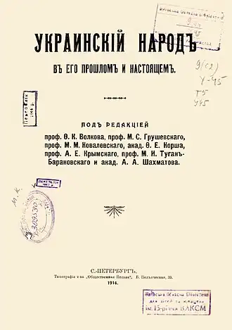 Первая энциклопедия украиноведения была создана в 1914—1916 годах в Петрограде по инициативе профессора М. С. Грушевского под редакцией выдающихся учёных А. А. Шахматова, Ф. К. Вовка (Волкова), М. С. Грушевского, Ф. Е. Корша, А. Е. Крымского, М. И. Туган-Барановского, С. Л. Рудницкого, М. Ковалевского, П. Я. Стебницкого.