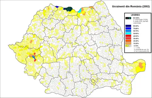 По результатам переписи 2002 года в Румынии численность украинцев составляет 61 091 человек. В коммунах с преобладанием украинского населения в 2002 году проживало 54,5 % украинцев Румынии: