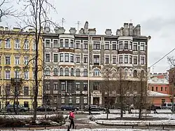 - Дом № 17 — доходный дом военного инженера Н. И. Полешко, 1904—1907, арх. Н. И. Полешко, эклектика[12]. В начале XX века доме находилась частная учительская семинария Полубинских. В 1908 году здесь открывается частное реальное училище В. П. Кузьминой. В 1920—1925 годах здание занимает ЦИЖВЯ — Центральный Институт живых восточных языков. C 1924 г. в доме № 17 жили учёные-востоковеды[13]: ректор ЦИЖВЯ, китаист Павел Иванович Воробьёв; ректор ЦИЖВЯ, профессор ЛГУ, тюрколог, академик Александр Николаевич Самойлович; китаисты В. М. Алексеев (кв. 5, с 1924 года), Н. А. Невский (кв. 5, с 1929 по 1937 год) и его жена Исоко Мантани — Невская (кв. 5, с 1933 по 1937 год), Борис Александрович Васильев, тюрколог Николай Георгиевич Таланов, Николай Иосифович Конрад(кв. 7). Арестованы в 1937—1938 годах.