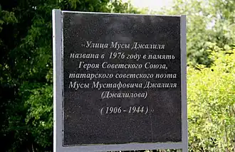 Улица названа в честь известного татарского поэта и борца антифашистского подполья Мусы Джалиля. В самом начале улицы, недалеко от долины реки Городни, установлен памятник поэту.