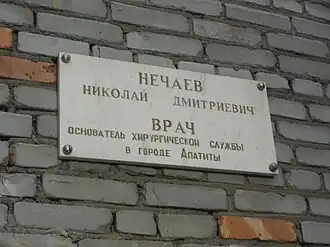 Апатитской городской больнице изготовить, а производственному предприятию жилищно-коммунального хозяйства установить на одном из домов по улице Нечаева мемориальную доску».