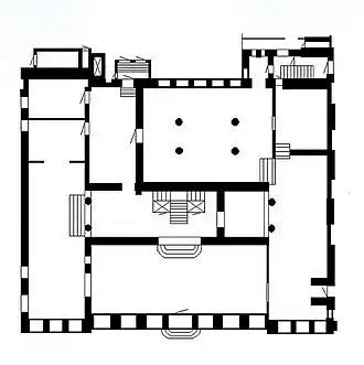 Двери: входные — деревянные массивные с металлическими пластинами с растительным орнаментом; межкомнатные двери — деревянные филёнчатые и деревянные остеклённые[25].