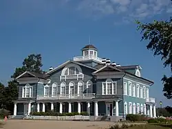Главный дом усадьбы Гальских имеет ярко-голубые фасады. Он стоит на берегу реки Шексны и обращает на себя внимание туристов проходящих мимо теплоходов[1].