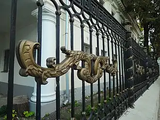 Кованая ограда на каменном штукатуренном и побелённом цоколе состоит из секций, закреплённых на тонких колоннах художественного литья. Каждая колонна обвита ветвью и завершена своеобразной капителью в виде листьев, на которой — плита (абака), покрытая сверху конусообразным завершением. Секции ограды составляют вертикальные полосы квадратного сечения; по верху и по низу проходят горизонтальные пояса, в основе которых — орнамент, напоминающий меандр. В средних частях секции помещены литые декоративные элементы — венки славы. Рисунок решёток калиток и двустворчатых ворот аналогичен, но несколько упрощён. В средней части каждого из полотнищ ворот — композиция «тройной венок на копье»[7].