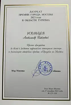 - ↑ Городские премии в области туризма вручили в Москве. Рамблер/новости (30 января 2024). Дата обращения: 19 февраля 2024. Архивировано 19 февраля 2024 года.
