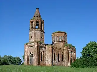 Когда деревянный собор обветшал, на её месте была в 1855 году построена кирпичная церковь в стиле ранней эклектики на окраине села на высоком холме над ручьём. Помимо главного Успенского престола имелись два придела с северной и южной сторон. Церковь, имеющая высокую колокольню, окружала кирпичная ограда с двумя воротами и двумя калитками. Собор возводили священник Павел Оболенский, прихожане и сторонние благотворители. Новосооруженный храм освятили также в честь Успения Божией Матери. Наряду с главным он имела еще два придела — Никольский и Собора Иоанна Предтечи. Церковь опоясывала кирпичная ограда с двумя калитками и двумя воротами. [1]