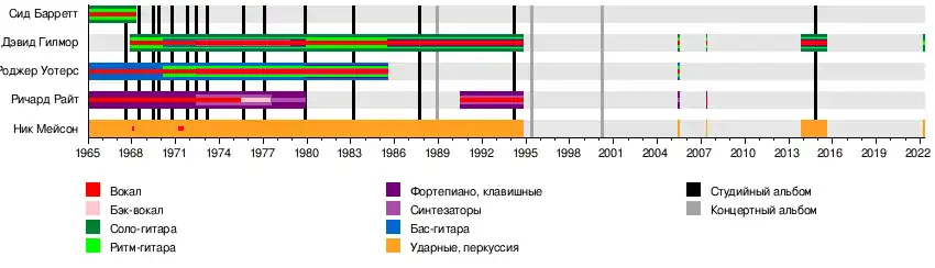 Состав британской рок-группы Pink Floyd менялся несколько раз. Группа была основана в 1965 году Сидом Барреттом (гитара, вокал), Ником Мейсоном (барабаны), Роджером Уотерсом (бас-гитара, вокал) и Ричардом Райтом (клавишные, вокал). Гитарист/вокалист Дэвид Гилмор присоединился к группе в декабре 1967 года; Барретт ушёл в апреле 1968 года из-за ухудшения психического здоровья. С 1970-х годов с группой играли различные дополнительные музыканты как в студии, так и на концертах. Вследствие творческих разногласий и перенапряжения Райт покинул Pink Floyd в 1979 году, а 1985 году вслед за ним ушёл Уотерс. Со временем Райт вернулся в качестве сессионного музыканта, а затем и в качестве полноправного участника. Барабанщик Ник Мейсон является единственным участником группы, появившимся на всех студийных релизах[1].