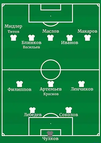 | «Динамо» Москва: Чулков - М.Соколов, Лебедев - Ленчиков, Краснов, Филиппов - Макаров, Иванов, Маслов, К.Блинков ОППВ: Матвеев - Исаев, Пчеликов - Пахомов, В.Ратов |