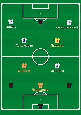 | «Динамо» Москва: Фокин - Радикорский, Чернышев, Богданов - Качалин, Елисеев - Трофимов, Смирнов, Назаров, Поставнин, Ильин |