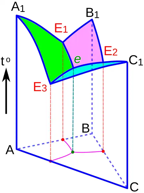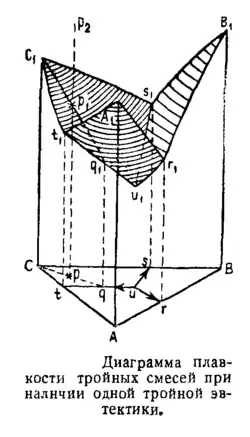 Изображённая на рис. TD пространственная диаграмма состояния трёхкомпонентной системы с одной тройной эвтектикой[4] соответствует простейшему случаю, когда три компонента А, В и С в бинарных комбинациях А—В, В—С и С—А дают только простые эвтектики. Для изображения свойств такой системы строят прямую призму, в основании которой лежит треугольник Гиббса — Розебома; точки основания треугольника дают состав смесей, а на рёбрах призмы откладывают температуры. Точки А1, B1, С1 отвечают температурам плавления чистых компонентов; кривые А1r1 и В1r1 есть кривые плавкости бинарных смесей А—В и лежат на грани А1АВВ1 призмы; r1 — эвтектика бинарной системы А—В. Такими же эвтектиками являются s1 в бинарной системе B—С и t1 в бинарной системе С—A, лежащие на соответствующих гранях призмы; u1 — тройная эвтектика, в которой в равновесии сосуществуют три твёрдые фазы и расплав, и в которой тройная смесь плавится/застывает как одно целое; r1u1, s1u1 и t1u1 — эвтектические кривые.