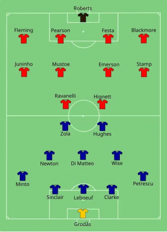 По сути, игра была сделана уже на 42-й секунде. Ди Маттео получил мяч от Петреску и поразительным дальним ударом пробил точно в ворота Бена Робертса. «Боро» пытался отыграться и Кертис Флеминг даже забил гол, но арбитр отменил его из-за офсайда. На 24-й минуте Фабрицио Раванелли получил травму и покинул поле. Большая часть матча прошла в упорной борьбе. За восемь минут до конца матча Дзола, Петреску и Ньютон раскатали комбинацию, завершившуюся голом последнего. Джанлука Виалли вышел лишь на две последние минуты.