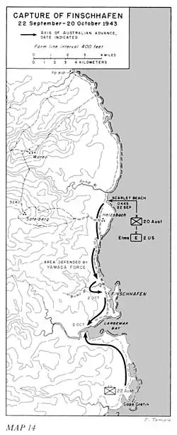 Операция по захвату Финшхафена была важна для обеспечения контроля над западным мысом пролива Витязь для строительства аэродромов и военно-морских объектов для предстоящей Новобританской кампании в рамках операции «Картвил»[3][4]. Ответственность за обеспечение полуострова Хуон была возложена на австралийскую 9-ю дивизию генерал-майора Джорджа Вуттена. 22 сентября австралийская 20-я пехотная бригада под командованием бригадира Виктора Виндейера при поддержке артиллерии 2/12 полевого полка, а также полевой роты инженеров и полевой машины скорой помощи[5] приземлилась в Скарлет-Бич - примерно в 10 километрах (6,2 мили) к северу от Финшхафена[4] - и приступила к созданию там плацдарма[6]. В то же время 22-й пехотный батальон, подразделение австралийского ополчения, высадившийся в начале сентября к востоку от Лаэ, чтобы ослабить войска, удерживающие плацдарм[7], начал преследование японцев, отступавших на восток, в направлении Финшхафена чтобы усилить давление на их южный фланг[8].