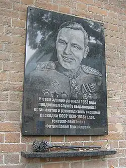 7. 1 2 3 4 5 6 Бондаренко А.. Возвращение генерала Фитина. — 10 октября 2017 года в 16 часов в Москве на территории пресс-бюро Службы внешней разведки Российской Федерации был открыт памятник генерал-лейтенанту Павлу Михайловичу Фитину (1907—1971), возглавлявшему советскую разведку с 1939 по 1946 годы, то есть на протяжении всей Второй мировой войны. regnum.ru (10 октября 2017). Дата обращения: 15 ноября 2020. Архивировано 17 ноября 2020 года.