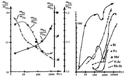 На практике косвенно фракционирование иллюстрировалось рядами распределения возрастов по минералам и методам определения возраста. Например, построены последовательности: для Карелии — ПЛ(Rb-Sr)>МУ(Rb-Sr)>МУ(K-Ar)≈Ми(Rb-Sr)>БИ(Rb-Sr), где МИ- микрклин, МУ- мусковит; для Финляндии- МИ(Rb-Sr)>МУ(Rb-Sr)>БИ(Rb-Sr)≈БИ(K-Ar). Более строго это сопоставление осуществляется на основе сравнения по минералам значений отношений соответствующих изотопов. В качестве примера в таблице № 2 приведены некоторые ряды по величинам этих отношений:
