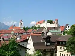 - Замок епископов (XVI—XIX вв.) на вершине холма Шлоссберг. Замок вплотную прилегает к монастырю и между ними нелегко провести отчётливую границу. С возвышенности открывается красивый вид на бирюзовые воды реки Лех и крыши Фюссена. В Верхнем замке интерес представляют росписи-«обманки» XVIII века.
