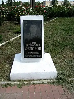 Памятная доска И. Е. Федорову на стене дома в ЖК «Город Набережных» в городе ХимкиВ Парке Победы Каменска-Шахтинского Герою установлена мемориальная доска[8].