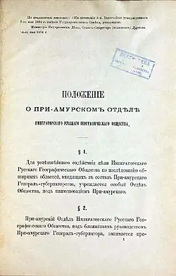 Для успешного содействия цели Императорского Русского географического общества по исследованию обширных областей, входящих в состав Приамурского генерал-губернаторства, учреждается особый Отдел Общества, под наименованием Приамурского.
